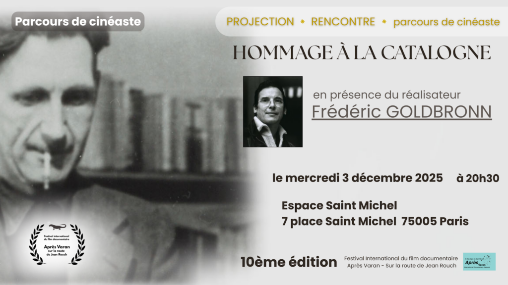 Cette édition s’ouvre sur le parcours de l’un de nos parrains du festival, Frédéric Goldbronn et son film Hommage à la Catalogne. Le Mercredi 3 décembre 2025, l’ ouverture du festival se célébrera avec son dernier film en date, un récit sur l’engagement de l’écrivain George Orwell dans la révolution et la guerre d’Espagne. En 2026, nous poursuivrons la traversée de son parcours avec plusieurs de ses films liés à la mémoire.